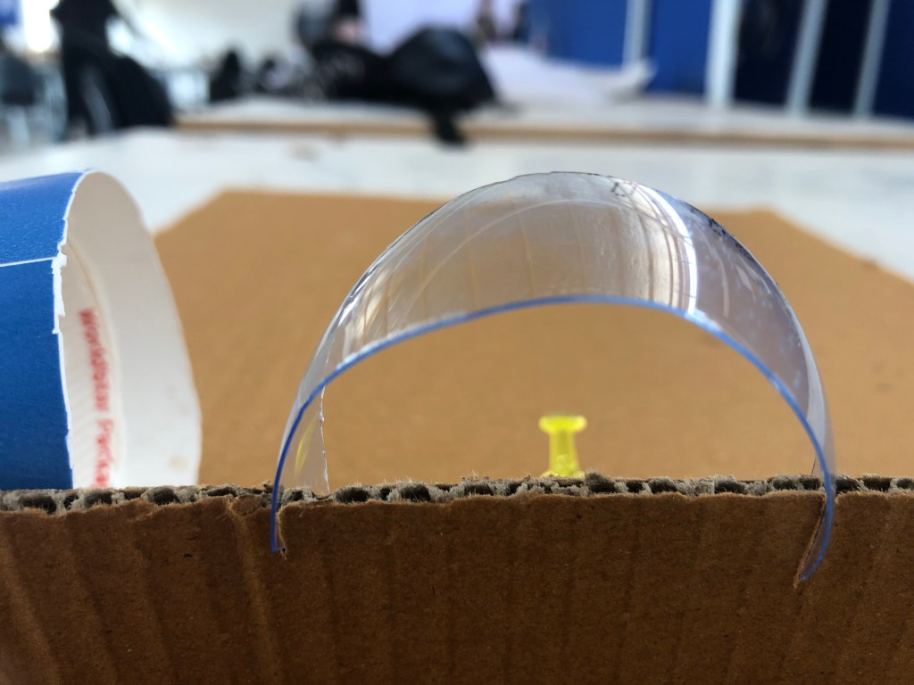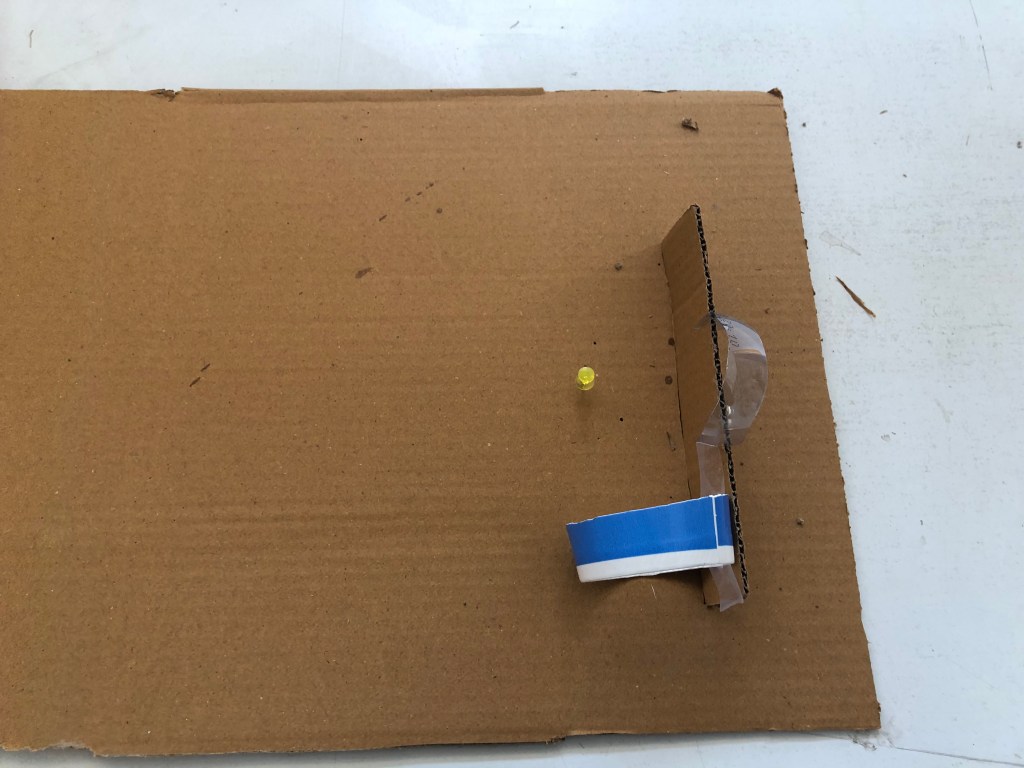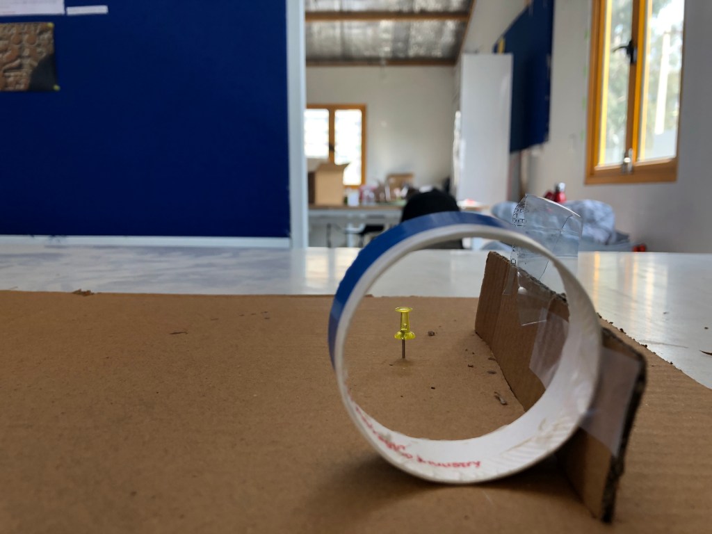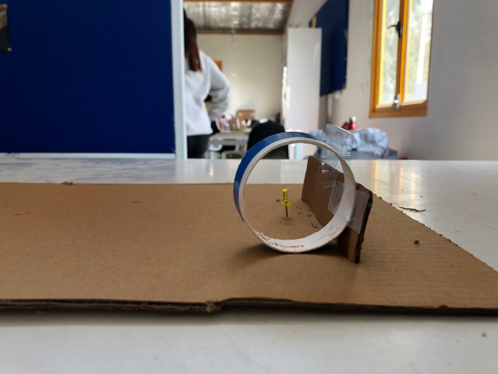 This time we have to make two portals, one for the body and other for the eye. we were given some piece of cardboard which would work as our materials for making portals. making portals with piece of cardboard was not easy, at first i wasnt able to understand anything expect that black door, i was figuring that how will i make that black door with piece of cardboard. then first i figured about my scaling device, what helped understand the scale for building structure. then i chose a thumb pin as my scaling object, as it can be move easily. then i choose paper cup upper part to make portal for the body and for the eye i choose small plastic circular piece. they was conditions that not to use to much fevicol or other gluing stuffs, so i cut the cardboard and tried to do interlocking it with cardboard and its worked.